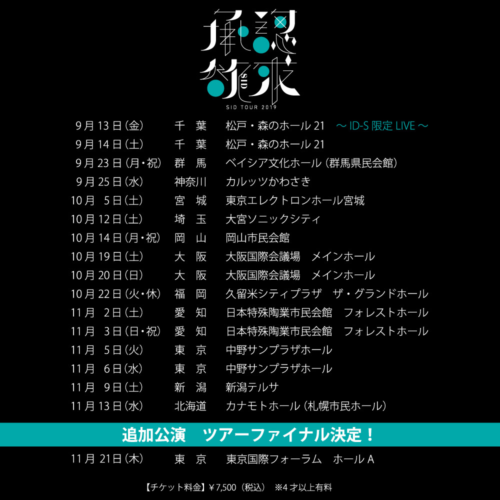 MEDIA WEB SID 20th Anniversary Special Siteオープン! 2023 年 1 月 1 日 LIVE SID 20th Anniversary Premium FANMEETING TOUR 2023 チケット情報 2023 年 6 月 30 日 GOODS SID 20th Anniversary Exhibition GOODS情報 2023 年 6 月 28 日